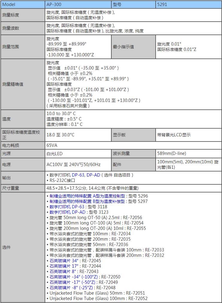 | 測量讀數(shù) | 旋光度,國際標(biāo)準(zhǔn)糖度(無溫度補償),國際標(biāo)準(zhǔn)糖度(自動溫度補償),比旋光度,濃度,純度 |