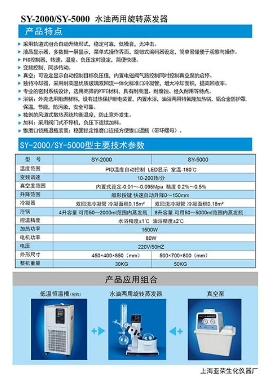 SY-2000型是我廠研發(fā)的綜合型油浴、水浴兩用旋轉(zhuǎn)蒸發(fā)器。整機(jī)設(shè)計(jì)美觀大方,合理緊湊,操作簡捷方便,控溫精準(zhǔn),性能可靠。除了實(shí)用和人性化的設(shè)計(jì)以外,堅(jiān)固、耐用的性能也是上海亞榮生化儀器廠的產(chǎn)品最重要的特點(diǎn)。作為國內(nèi)旋轉(zhuǎn)蒸發(fā)儀的領(lǐng)先者,完善的產(chǎn)品質(zhì)量和銳意進(jìn)取、不斷創(chuàng)新的精神市上海亞榮生化儀器廠企業(yè)品牌最重要的構(gòu)成元素。