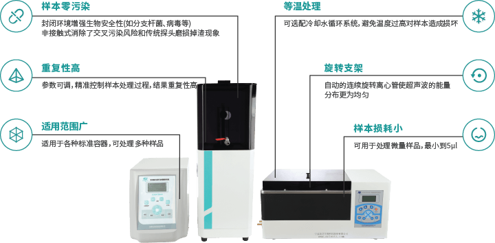 非接觸式超聲波粉碎機也叫杯式超聲破碎儀,可在密閉容器、無菌、可超微量條件下進行破碎。相比傳統(tǒng)的探頭超聲波細胞粉碎機,該儀器具有一次可同時檢測多個樣品、實驗效率高、無需頻繁操作探頭、避免樣本交叉污染等優(yōu)勢。且該儀器可選配低溫恒溫裝置,便于樣品在4-10℃環(huán)境內(nèi)工作,使能量分布均勻,超聲作用完全。逐漸成為ChIP(染色質(zhì)免疫共沉淀)和DNA剪切研究平臺不可缺少的標(biāo)準(zhǔn)化工具。