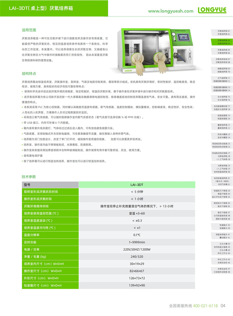厭氧培養(yǎng)箱是一種可在無(wú)氧環(huán)境下進(jìn)行細(xì)菌培養(yǎng)及操作的專用裝置,它能提供嚴(yán)格的厭氧狀態(tài)、恒定的溫度培養(yǎng)條件和具有一個(gè)系統(tǒng)化、科學(xué)化的工作區(qū)域,本裝置內(nèi),可以培養(yǎng)很難生長(zhǎng)的厭氧生物,又能避免以往厭氧生物在大氣中操作時(shí)接觸氧而死亡的危險(xiǎn)性, 因此本裝置是厭氧生物檢測(cè)科研的理想設(shè)備。
